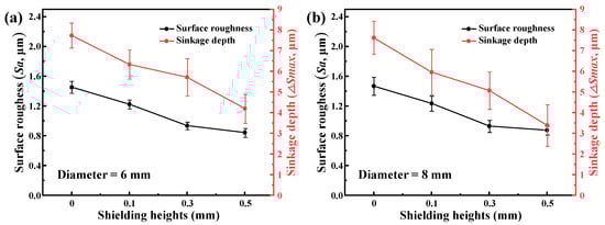 Surface roughness and sinkage depth for holes with different diameters at various shielding heights: (a) overhanging holes with a diameter of 6 mm; (b) overhanging holes with a diameter of 8 mm.