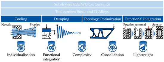 - Functional integration of sensors and actuators: The manufacturing of complex geometries and new AM process variants allows the integration of electronics such as sensors and actuators [236]. This enables real-time monitoring and control of the cutting process. Compared to existing systems, AM offers advantages regarding the compactness of the integrated electronics, proximity of sensors and actuators to the region of interest, and ease of mounting. Further developments in self-sufficient energy supplies, such as energy harvesting and the printing of electronic components, could lead to a deeper understanding of the cutting process and enable online process control.