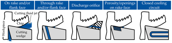 | Ti-6Al-4V | [171] | Helical milling tool with individualized nozzle design (combination of L-shaped and elliptical nozzles directed on rake face); tool life increase of 27%, chip volume reduction of 25% | |