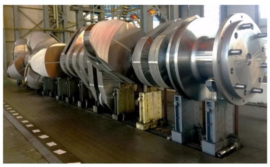 Semi-Built Crankshaft. This is currently the most popular type for large marine engines. It consists of two main components: the journal and the crank throw [,]. The forged journal is shrink-fitted into the crank throw, which is a single piece comprising two webs and a pin, forged as one unit. This design improves grain flow. Furthermore, the assembly offers additional flexibility, allowing it to sustain some degree of misalignment.
