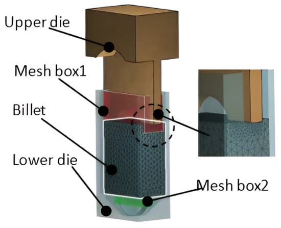 The leading metal forming software, Forge® (version3.1, Transvalor S.A., Biot, France), was used to simulate the various NNS forging processes of the crank throws. Figure 5 illustrates the finite element models, which include the billet, the upper die, and the lower die. Both dies are assumed to be ‘rigid’ (i.e., non-deformable), while the billet is considered deformable. At the start of the simulation, the billet is meshed with 30,000 tetrahedron elements. To maintain accuracy and optimize computational time, the mesh box technique was employed. This technique controls mesh refinement in highly deformed zones, as indicated by boxes 1 and 2 in Figure 5.