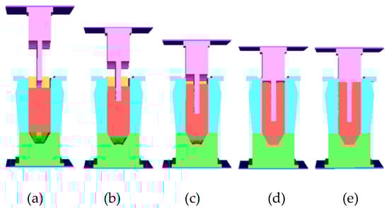 Figure 6 shows a simulation of the OSE process for a crank throw. Extrusion begins immediately when the punch contacts the billet, as the billet’s cross-section closely matches that of the die cavity. This process involves combined extrusion, with both ends of the billet deforming simultaneously. Figure 6b shows the backward extrusion at the upper end and the forward extrusion at the lower end. When the punch stroke reaches 95% (Figure 6d), the pin-end die cavity is fully filled, marking the end of the combined extrusion phase and the beginning of backward extrusion at the upper end. Finally, the material flows upward, completely filling the die cavity to form the journal end (Figure 6e).