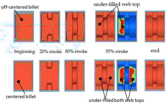 Figure 8 shows the load-time curves for both cases. The load curves are nearly identical except at the end of the forging process. In the off-centered billet case, additional force is required at 95% stroke to push the material from the right side to the left, ensuring the left web fully fills the die cavity. The maximum load for a centered billet is 41,000 tons, whereas for an off-centered billet, it reaches 49,000 tons.