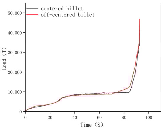 Load-time curves for extrusion with off-centered billet and centered billet.