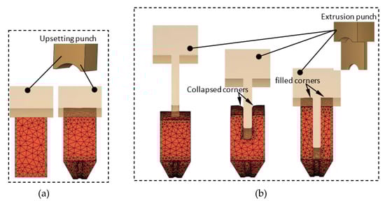 Figure 9 illustrates the U/BE process for a crank throw, where an upsetting step is incorporated to ensure the billet is centered in the die. In this method, during the upsetting stage, an upsetting punch with an end face matching the shape of the webs is used. The billet undergoes closed-die upsetting at this stage, followed by backward extrusion using an extrusion punch.