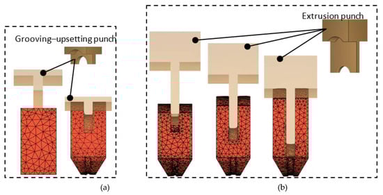 Based on the U/BE process, a groove (actually obtained through backward extrusion) is added during its upsetting step. Grooving–upsetting is a combined extrusion process, as shown in Figure 11. The principle is that after the billet is placed into the die cavity, it is first pressed by a punch with a “tongue” extending from its end face. The deformed billet is shown in Figure 11b at the end of grooving–upsetting. This process retains the advantage of ensuring the billet remains centered, as in the U/BE process. It not only forms the two web ends and the crank pin end but also produces a shallow guiding groove that serves to correctly position the extrusion punch for the subsequent backward extrusion, which helps control the web thickness variation.