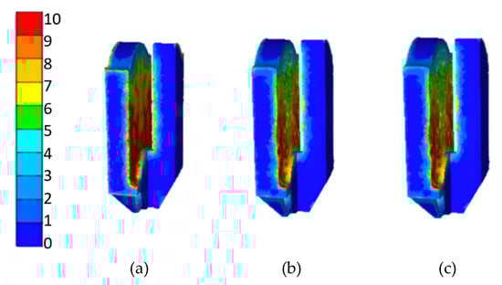 At the end of a forging process, the product’s temperature and its equivalent strain are two key factors affecting the forging’s microstructure. A high final forging temperature tends to cause grain growth. Although deformation can refine the grains during the forging process, if the forging temperature is too high, the previously refined grains tend to coarsen, resulting in lower properties of the forging []. Figure 13 and Figure 14 show the temperature fields and equivalent strain fields of the forged throw at the end of the three methods, respectively. It is clear that they are essentially the same.