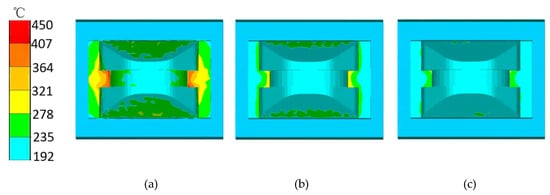 Lower die temperature at the end of the three processes. (a) OSE, (b) U/BE, and (c) G–U/BE.