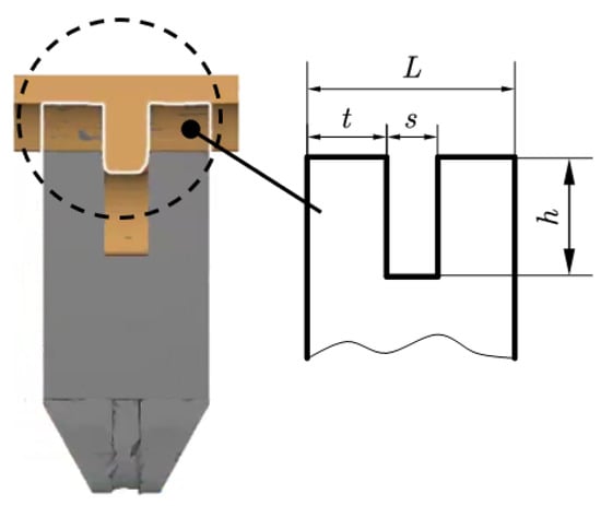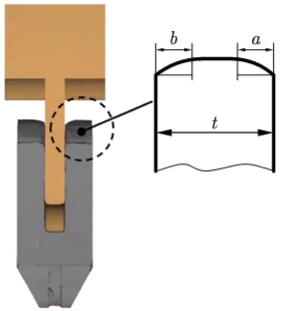 As is known from plastic mechanics, the groove forming can be approximated as a plane strain problem, where the main deformation zone is located beneath the punch. During backward extrusion, under the action of the punch, the metal flows into the two webs. This flow is restricted by the size and shape of the deformation zone, and the characteristics of the deformation zone depend on the web gap width (the punch width) and the thickness of the web. These two dimensions vary with crank throws of different specifications. For convenience, the following two parameters—relative punch width (κ) and relative groove depth (χ)—are introduced, expressed by Equations (2) and (3):