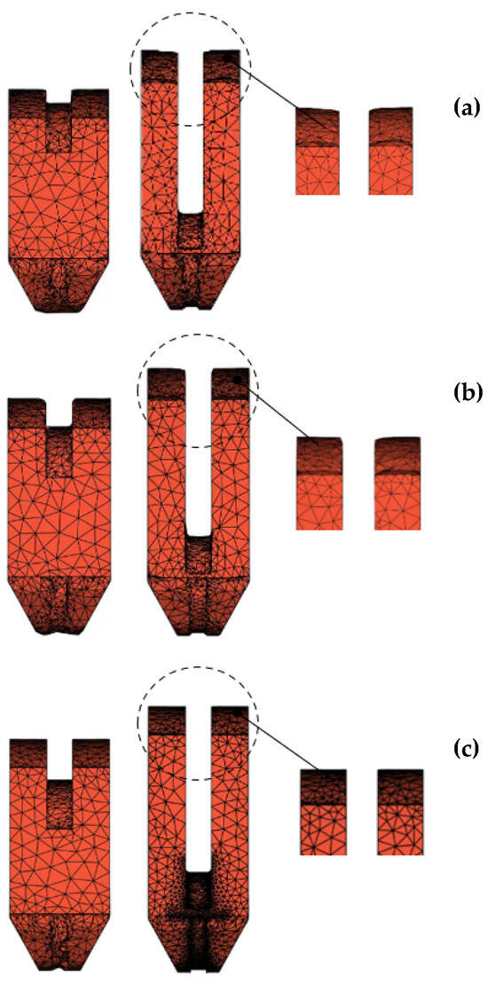 It can be seen from Table 6 that when the relative groove depth (χ) ≥ 1.5, the journal end of the web formed during grooving–upsetting remains unaffected during the subsequent backward extrusion. Figure 18 shows a side-by-side view of the journal end shape at the end of grooving–upsetting and at the end of the subsequent backward extrusion with relative groove depths of 0.5, 1.0, and 1.5, respectively. It is clear that with χ equal to or greater than 1.5, there are no obvious collapsed corners at the web’s journal ends, and the well-formed journal end shape remains unaffected during the following backward extrusion.