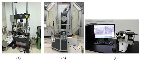 Experimental equipment: (a) material fatigue testing system; (b) pendulum impact testing machine; (c) metallographic microscope.