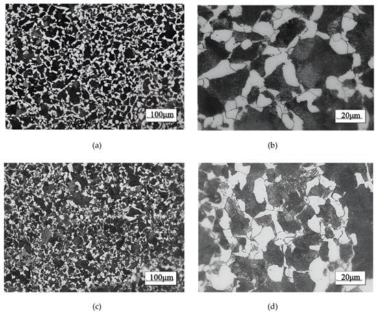 Microstructures of forged throws: (a) specimen #1 100 µm scale, (b) specimen #1 20 µm scale, (c) specimen #2 100 µm scale, and (d) specimen #2 20 µm scale.
