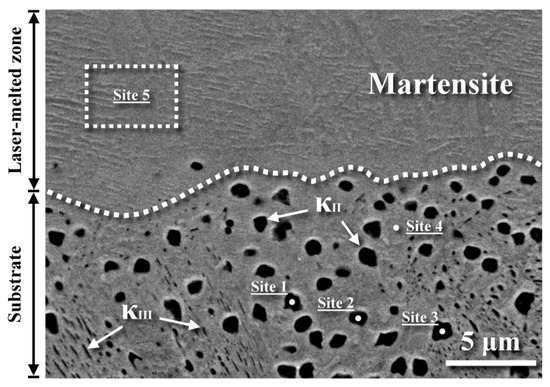 Figure 1 shows the microstructure of the LSM samples in a cross-sectional direction with indicated sites, of which the chemical compositions were subsequently determined by EPMA. The NAB consisted of granular κII with a size of less than 3 μm, the lamellar κIII, and un-resolved κIV in the α matrix. The results of EPMA analysis on distinct phases in the examined samples are listed in Table 2. Because the diameter of the yielded volume of the electron beam was about 1 μm, the composition of the examined phases with size less than 1 μm would be hard to determine accurately. According to the atomic ratio listed in Table 2, the κII (Site 1 to Site 3) could be the Fe3Al intermetallics. By contrast, the α-Cu (Site 4) was the Cu matrix alloyed with Cu-8Al-1.6Fe-1.7Ni (in approximate wt.%). As pointed out in prior studies [5,6,7,8], the complex or non-homogeneous microstructures present in the NAB alloy are reported to degrade its mechanical and corrosion properties. After LSM, the chemical composition of the laser-melted zone (Site 5) comprised Cu-10Al-5.5Fe-4.4Ni (in approximate wt.%). The dissolution of intermetallics after LSM resulted in a more homogeneous structure in composition and an increase in Fe and Ni contents in the melted zone, as compared with those in the α-Cu.