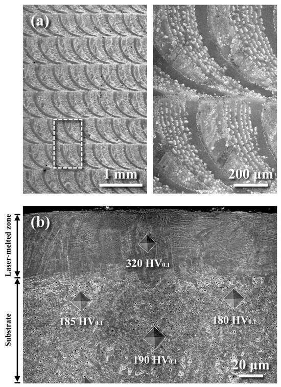 (a) The top surface appearance showing the laser-melted zone of the LSM sample at (left) lower and at higher magnification (right, enlarged from the dashed zone); (b) the cross-sectional view of the LSM sample.