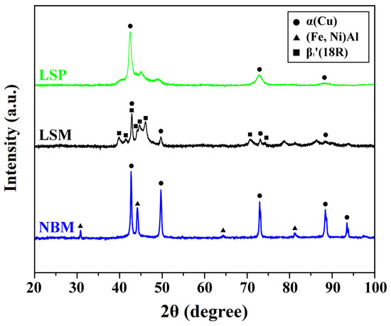 The phase constituents of the NBM, LSM, and LSP samples identified by XRD are shown in Figure 3. It was revealed that the XRD spectrum of the NBM sample comprised mainly α-Cu and (Fe, Ni)Al intermetallics, which were also inspected and shown in Figure 1. In addition, several sharp peaks were present in the XRD spectrum of the LSM sample within 2θ = 40–50°, which were similar to those of the selective-laser-melted NAB alloy in the as-built condition [30]. It is reported that complex phases, including β′, β1′, and γ1′, might present in the laser-melted zone of the LSM sample [30]. By contrast, those fine peaks present in the LSM sample became hard to distinguish in the LSP sample. It seemed that the MSP caused the partial transformation of β1′ to α-Cu.