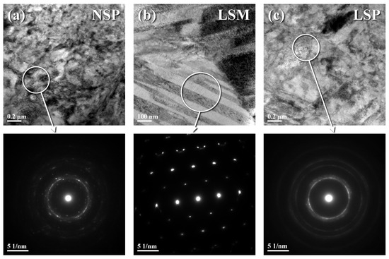 The detailed mechanism causing such a phase transformation was not known at this moment. The detailed microstructure of the NSP, LSM, and LSP samples examined by a TEM is shown in Figure 4, and the diffraction pattern of the inspected sample is attached below the figure. The result displayed that MSP caused the formation of a nanocrystal structure in the severely shot-peened zone, which was confirmed by the ring pattern of electron diffraction (Figure 4a). The fine-grained structure was expected to enhance the rapid formation of the protective passive film and reduced the occurrence of selective dissolution [31]. In addition, refined needle-like martensite with high dislocation densities and twins was formed in the laser-melted zone (Figure 4b). The exact crystal structure of the laser-melted zone was not able to be identified by diffraction pattern in this work. Moreover, the heavily peened zone of the LSP sample also consisted of a nano-grained structure (Figure 4c). Thus, the needle-like structure in the laser-melted zone transferred to a nanocrystal structure after MSP.