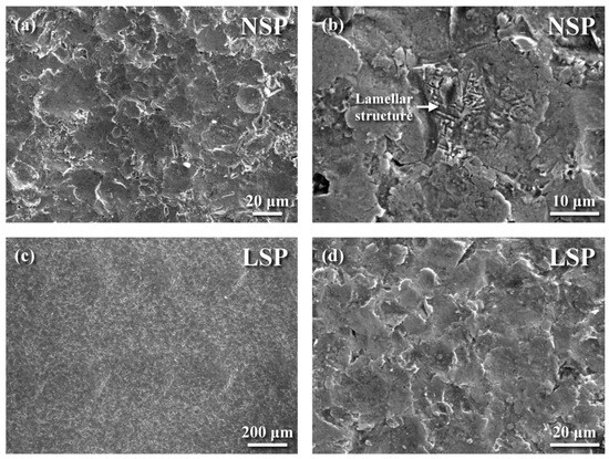 The surface morphology of the NSP and LSP samples is displayed in Figure 5. The peened surface of the NSP sample revealed small and shallow dents in different sizes (Figure 5a). It was noticed that micro-cracks were not formed on the surface of the peened sample. However, the remnant of the lamellar structure could still be seen under the applied peening intensity (Figure 5b). It was deduced that the intensity of MSP applied in this work was not high enough to completely remove or disperse the coarse lamellar structure. Moreover, the surface appearance of the LSP sample still exhibited the regular traces of solidified ripples (Figure 5c). At a higher magnification, the bombarded dents covered all the impacted surfaces of the LSP sample (Figure 5d).
