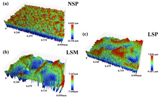 3D contour profile of the (a) NSP, (b) LSM, and (c) LSP samples.
