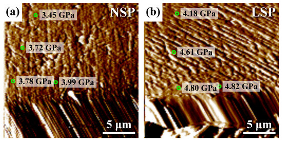 The determined nano-hardness near the outermost surface of the (a) NSP and (b) LSP samples.
