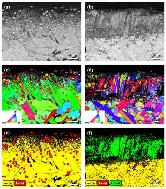 The LSP microstructure analyzed by EBSD is shown in Figure 8. The BC map revealed that the laser-melted zone of nearly 40 μm in thickness consisted of refined columnar grains. Due to the epitaxial growth from the un-melt substrate, the aligned columnar grains were formed in the laser-melted zone after solidification (Figure 8b). Furthermore, the external surface of the LSP also exhibited a thin layer of fine-grained structure, similar to that of the NSP sample therein (Figure 8a). As shown in Figure 8d, the IPF of the LSP sample revealed finer columnar grains in the laser-melted zone. It was seen that those columnar grains with different orientations predominantly aligned in a normal direction to the external surface (Figure 8d). Similar to the NSP sample, the refined structure in the external surface of the LSP sample was also hard for EBSD to reveal. The phase map (Figure 8f) confirmed that a single phase (Cu3Al) was formed in the laser-melted zone, whereas observable Fe3Al precipitates were distributed in the α-Cu matrix.