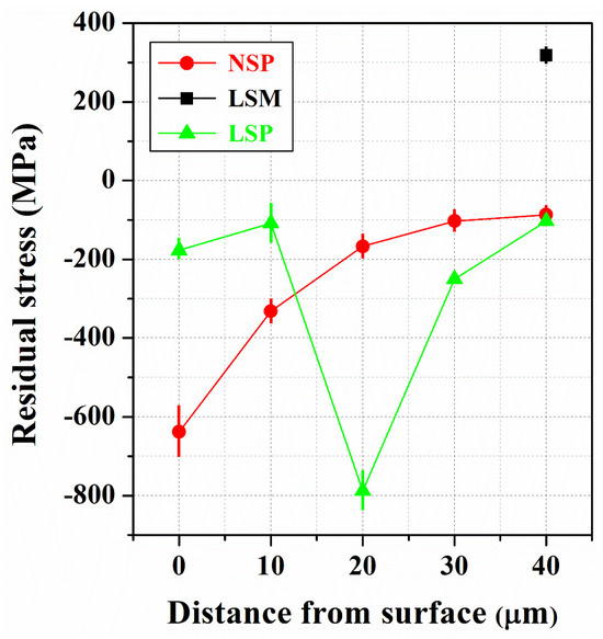 The residual stress distribution in the thickness direction of the NSP, LSM, and LSP samples from the surface to the interior.