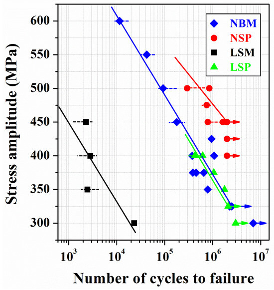 Fatigue stress (S) vs. cycle (N) curves of the NBM, NSP, LSM, and LSP samples.