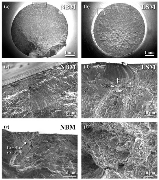 The macroscopic fatigue-fractured morphologies of the (a) NBM and (b) LSM samples; (c) quasi-cleavage of the NBM sample (enlarged from the dashed zone in Figure 11a) and (d) quasi-cleavage in the laser-melted zone of the LSM sample (enlarged from the dashed zone in Figure 11b); (e) fatigue crack initiation at the lamellar structure of the NBM sample; (f) dimple fracture at the final fracture zone.