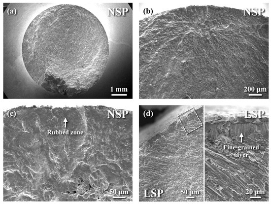 SEM micrographs showing (a) the macro-fractured appearance, (b) sub-surface crack initiation, (c) rubbed and squeezed feature around the outer profile of the NSP sample; (d) the macroscopic fatigue-fractured appearance (left) and microscopic fatigue-fractured feature around the external surface of the LSP sample (right, enlarged from the dashed zone in Figure 12d).