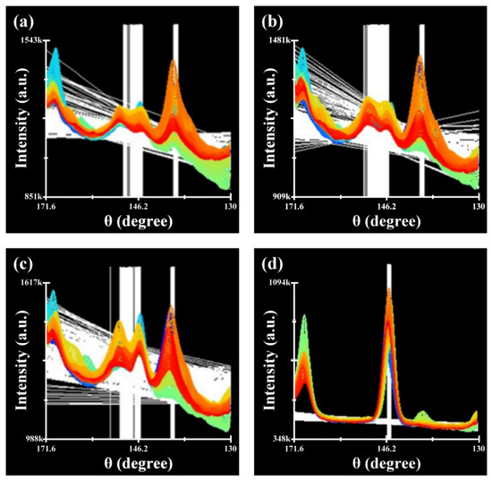 XRD spectrum of the LSP sample around a 2θ angle of 146.2° at distinct depths of (a) 0, (b) 10, (c) 20, and (d) 40 μm from the outmost surface.