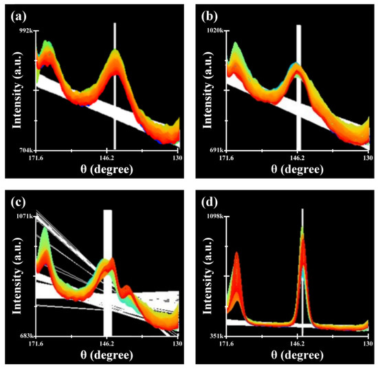 XRD spectrum of the LSM sample around a 2θ angle of 146.2° at distinct depths of (a) 0, (b) 10, (c) 20, and (d) 40 μm from the outmost surface.