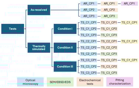 A flowchart of analyses and conditions, with the respective number of specimens, is presented in Figure 1. Three (03) specimens of SDSS S32750, with a thickness of 10 mm, were used in the physical simulation of each one of three (03) HTHAZ conditions with varying cooling rate (C1, C2, and C3). In sequence, all specimens were analyzed under the optical microscope (OM) for ferrite quantification. The results of the 03 thermally simulated (TS) conditions were compared with the material in the as-received (AR) state. Electrochemical tests were performed in duplicate, and afterwards, one specimen was used for pitting evaluation. Scanning electron microscopy (SEM), energy-dispersive spectroscopy (EDS), and electron backscatter diffraction (EBSD) were performed in one specimen of each group.
