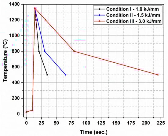 Table 2 presents the conditions studied with their respective values of cooling rates (CRs), associated times, and heat inputs (Q), for the peak temperature of 1350 °C, whose values were obtained by the equations above. As shown in Figure 1, three repetitions were performed for each condition, totaling nine samples.