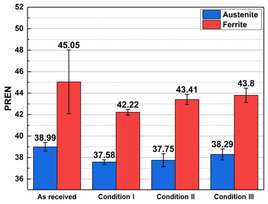 The average compositions of each phase obtained by EDS are summarized in Table 4, while maps showing element distribution in the as-received condition are presented in Figure 6, with Ni enrichment in austenite and Cr and Mo enrichment in ferrite. Because the technique has limitations when it comes to the detection and quantification of light elements, such as carbon (C) and nitrogen (N), these elements were not considered in the analysis [10,40,41,42]. Alternatively, for the calculation of the PREN, C and N amounts were taken from the material datasheet provided by the manufacturer (0.015% and 0.27%, respectively), while the concentration of other elements was determined using the EDS technique. Molybdenum’s behavior was the same in both phases, decreasing in comparison with the as-received condition and gradually increasing with decreasing cooling rate. In opposition, the Cr concentration increases discretely. PREN evolution is graphically represented in Figure 7, where one can notice that PREN decreases after thermal cycles in both phases, with a tendency to increase with decreasing cooling rate (and increasing ferrite fraction).