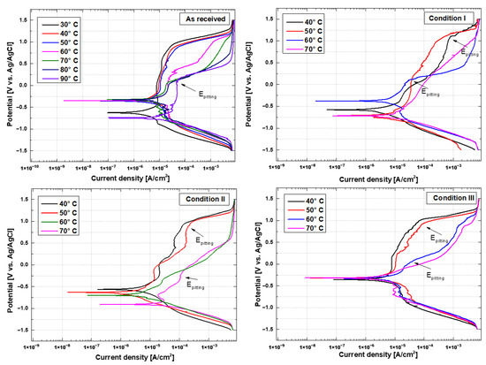 Tests were performed with a scanning rate of 1.0 mV/s, from −1500 mV to +1500 mV. Before each run, the open-circuit potential (OCP) was kept for one hour until its stabilization. Different temperatures were used to define the CPT of each condition, as shown in Table 3. Firstly, the as-received condition was tested in temperatures ranging from 30 °C to 90 °C to define the relevant test interval to understand the material’s behavior; this interval (40–70 °C) was then used to characterize simulated conditions. To determine the CPT, linear curves were traced tangential to the passive and transpassive regions of the polarization curve. The pitting potential (Epitting) corresponds to the intersection point of both curves [35,36,37]. With these values, it was possible to plot the pitting potential as function of temperature. The CPT is defined as the inflection point of the fitted polynomial curve. Two specimens of each condition were used to draw the polarization curves to ensure repeatability.