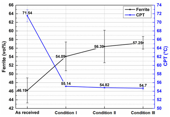 The relationship between the increase in ferrite fraction and the decrease in CPT is shown in Figure 9. The as-received material exhibited 46.19% ferrite and achieved the highest corrosion resistance, with a CPT of 71.54 °C. Thermally simulated samples showed ferrite fractions that were very close, ranging between 54.09% and 57.25%, as well as similar CPT values. This corroborates that the predominant mechanism in the reduction of CPT in thermally simulated samples was the increase in the ferrite phase.
