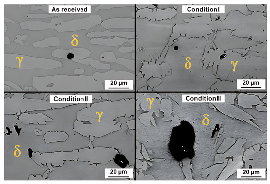 The microstructure of the different conditions after polarization tests conducted at 70 °C (as-received) and 50 °C (conditions I–III) is shown in Figure 10. In the as-received condition, pitting corrosion occurred primarily in ferritic grains, especially at ferrite (δ)/austenite (γ) interfaces. After thermal cycling, however, the pits were larger in size and fewer in number, indicating the increased severity of the attack. This increased pitting severity can be attributed to the fact that thermal cycling leads to greater reductions in PREN in the latter phase (6.28% in condition I, 3.64% in condition II, and 2.77% in condition III), as shown in Figure 7.