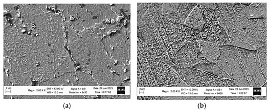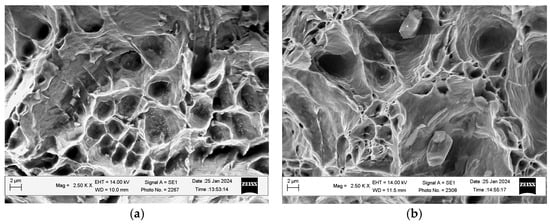 In the central parts of the fractures of the samples, where the initiation of their failure under uniaxial tension usually occurs, ductile dimple relief prevailed, and this mechanism dominated regardless of the location of the samples near the outer or inner surface of the pipe in the SBZ. However, on fractures of samples cut near the outer surface of the pipe, dimples grouped into conglomerates were quite often observed. Ridges with signs of a shear mechanism were formed along the perimeters of these areas (Figure 6a). The presence of such shear ridges indicated the formation of voids on carbides and non-metallic inclusions near the outer surface of the pipe even before tensile testing. The bridges between such individual voids were destroyed during the tensile testing of the samples due to the mechanism of their stretching until they broke, thereby forming a larger cavity. Merging with similar cavities formed by other nearby void conglomerates occurred due to a shear in the bridge between them. In contrast, the fractures of samples cut near the inner surface of the pipe had a uniform ductile relief characterized by uniform equiaxed dimples (Figure 6b). Similar results for steels exposed to high temperatures were obtained in other works [42].