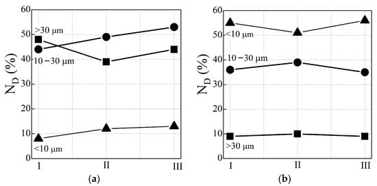 The proportion of grains ND of a certain size category relative to their total number in the structure of 12Kh1MF steel from the stretched bend zone of a pipe after its long-term (2.86 × 105 h) operation (a) and restorative heat treatment, according to the optimal mode (b) determined near the outer (I) and the inner (III) surfaces of the pipe, as well as in the center of its cross-section (II).