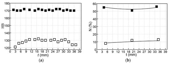 Change in the hardness HB (a) and the proportion of fine (≤15 µm) grains of N in the structure of 12Kh1MF steel (b) across the pipe wall thickness t of the stretched bend zone after its operation for 2.86 × 10⁵ h on the main steam pipeline of a TPP (□) and after additional application of restorative heat treatment to it according to the optimal mode (■).