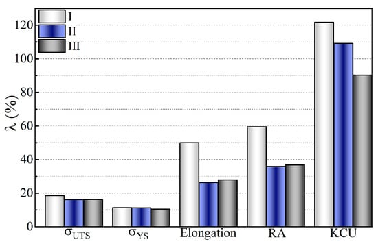 Change in mechanical properties (in percentage terms λ) for 12Kh1MF steel at different levels along the pipe wall thickness (I and III—near the outer and inner surfaces of the pipe; II—in the center of its cross-section) after its restorative heat treatment in comparison with the corresponding properties of this steel after 2.86 × 105 h of operation in the stretched bend zone of a TPP steam pipeline.
