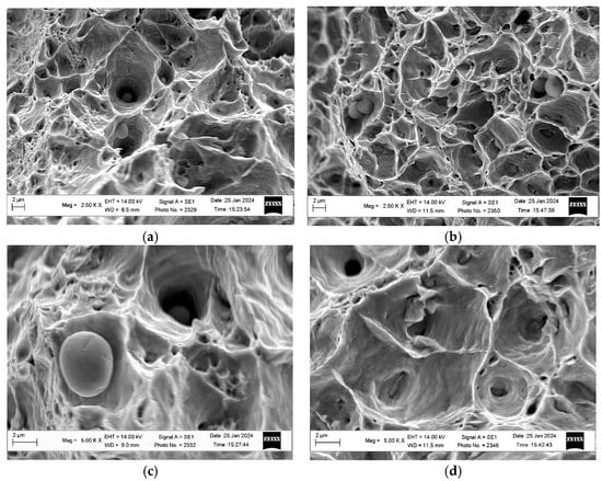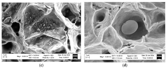 Fractographic signs confirming this phenomenon were also found on fractures of the used 12Kh1MF steel. In particular, at the bottom of the dimples on the fractures of samples cut near the outer surface of the pipe, a significantly smaller number of inclusions were found than on samples from the vicinity of its inner surface. It was believed that this fractographic feature indicated a more intense degradation of steel near the outer surface of the pipe due to the loss of cohesion of carbides and especially large non-metallic inclusions with the surrounding matrix (Figure 6). Additionally, at the tops of the ridges along the boundaries of the large dimples on the fractures of the steel operated near the outer surface of the pipe, there were no much smaller dimples with signs of the stretching of the bridges between them (Figure 6a,c). On the contrary, on the fractures of samples from the same pipe but cut near its inner surface, a noticeable feature of relief was chains of small equiaxed dimples. They were formed under the influence of normal tensile forces and located along the tops of the ridges, outlining larger dimples (Figure 6b,d). This, in itself, indicated a greater plasticity in the steel near the inner surface of the pipe. After all, the bridges between large dimples at least partially retained the ability to stretch during the tensile tests, instead of breaking due to shear.