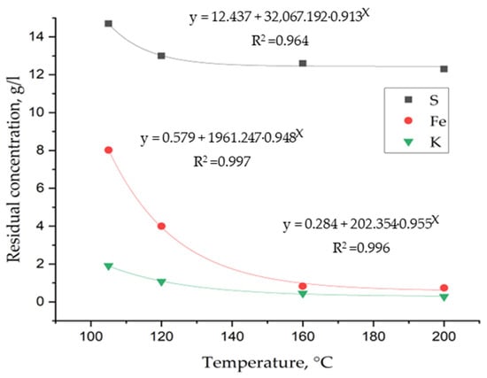 Figure 1. Temperature dependence of potassium, iron, and sulfur residual content in solution due to the formation of jarosite (120 min).