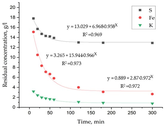 Figure 2. Dependence of potassium, iron, and sulfur residual content in solution due to the formation of jarosite on time (120 °C).