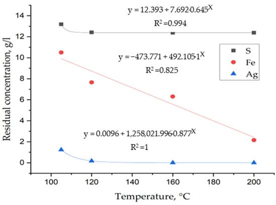 Figure 3. Temperature dependence of silver, iron, and sulfur residual content in solution due to the formation of jarosite (120 min).