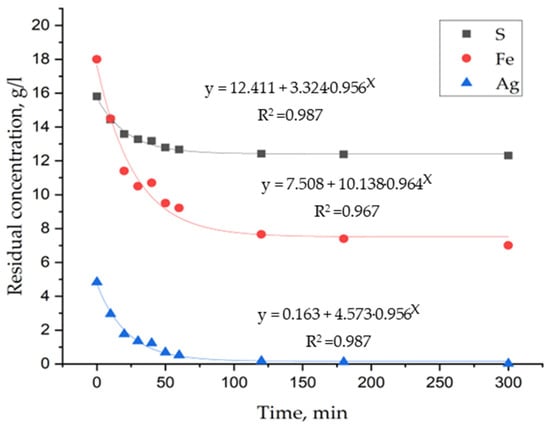 Figure 4. Dependence of silver, iron, and sulfur residual content in solution due to the formation of jarosite on time (120 °C).