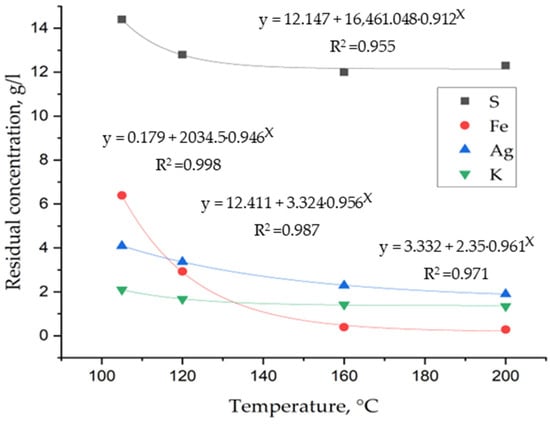Figure 5. Temperature dependence of potassium, silver, iron, and sulfur residual content in solution due to the formation of jarosite (120 min).