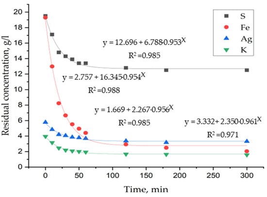 Figure 6. Dependence of potassium, silver, iron, and sulfur residual content in solution due to the formation of jarosite on time (120 °C).