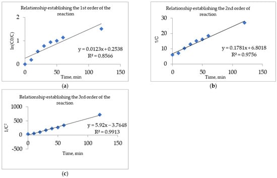 Figure 8. Determination of the reaction order of argentojarosite precipitation by the change in iron concentration over time (T = 120 °C): (a) 1st reaction order; (b) 2nd reaction order; (c) 3rd reaction order.