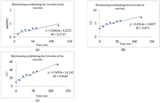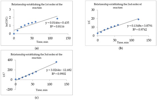 Figure 9. Determination of the reaction order of potassium–silver jarosite precipitation by the change in iron concentration over time (T = 120 °C): (a) 1st reaction order; (b) 2nd reaction order; (c) 3rd reaction order.