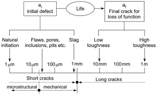The number of cycles is recorded and plotted in an S-N curve, which is used to compare and predict the joint’s fatigue life. This allows us to determine the time it takes for a joint to experience failure. According to Zerbst et al. [29], the average initial and final crack lengths are usually 1 mm and 10 mm, respectively, for materials under fatigue as shown in Figure 1. However, this would vary depending on the joint material chosen, the size of joints, adhesive type etc.